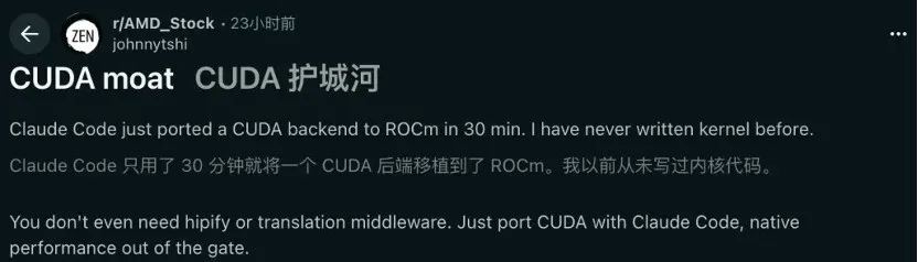 开发者johnnytshi在Reddit上分享了一个惊人的操作:仅仅30分钟,Claude Code便将一段完整的CUDA后端代码,成功移植到了AMD的ROCm上。